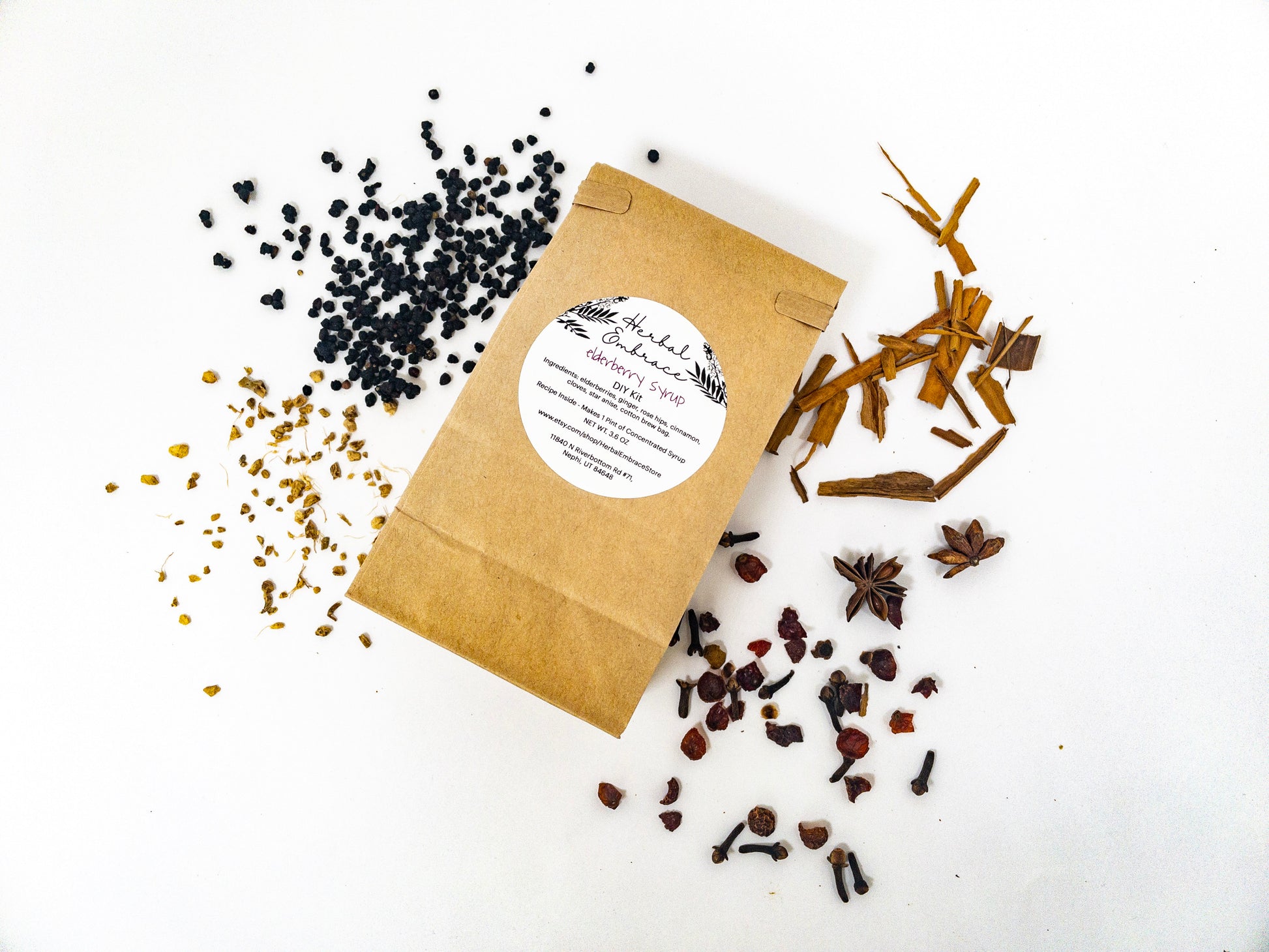 Ingredients: pre-measured organic elderberries from a local Utah family elderberry farm, ginger, Ceylon cinnamon, cloves, and star anise, with recipe and information sheet (tips, tricks, storage, dosage, etc.) No preservatives, no fillers, no anti-caking ingredients. Makes approximately 1 Pint of concentrated, extra-potent elderberry syrup.