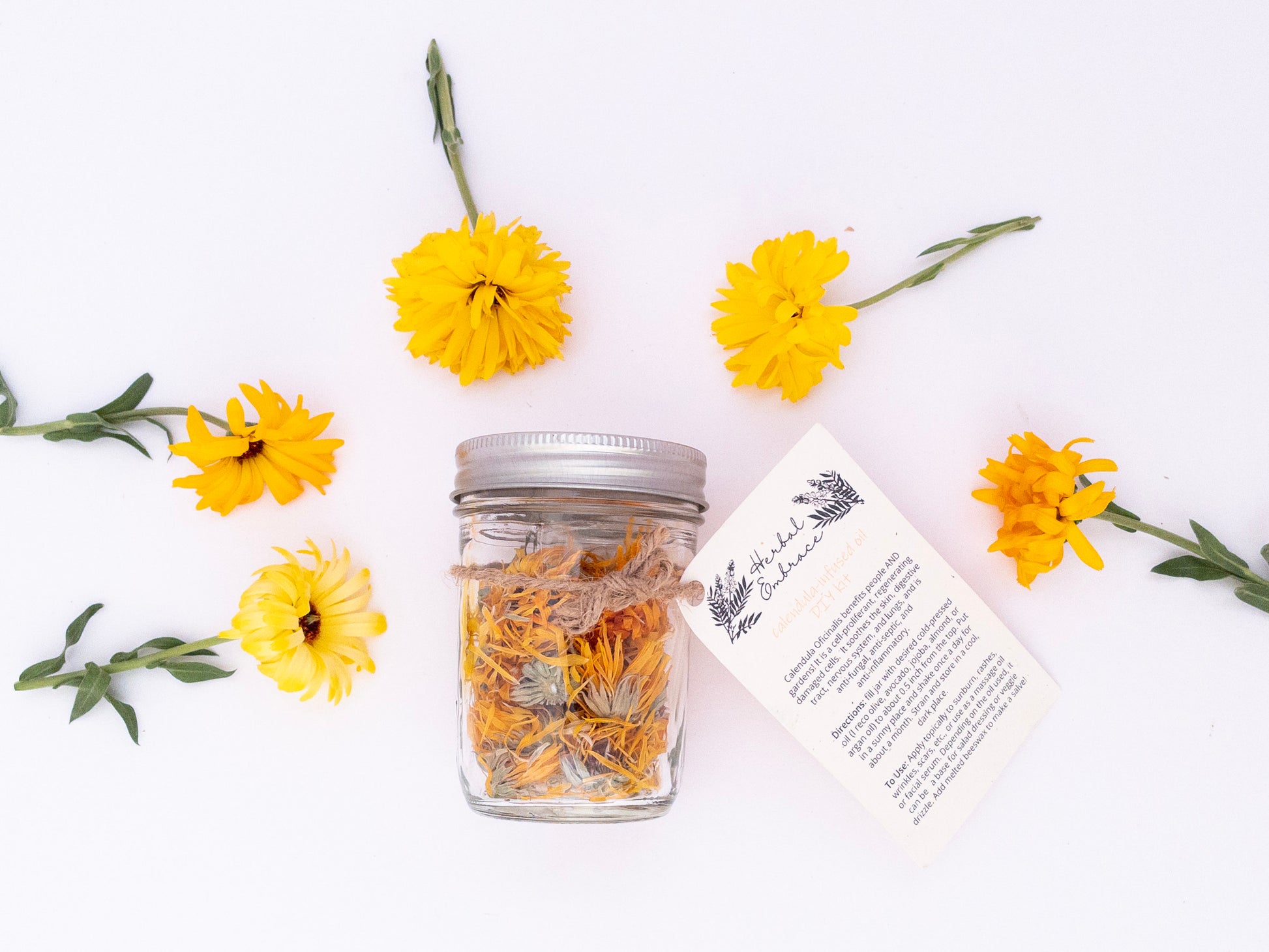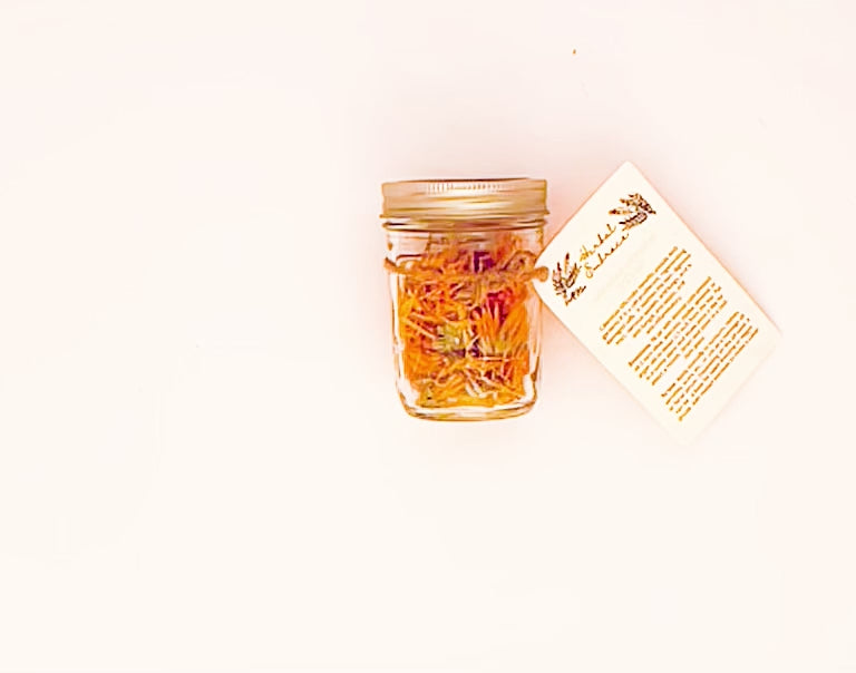 Dried calendula flowers and petals grown right on my chemical-free farm! Glass jar. Instruction card.
